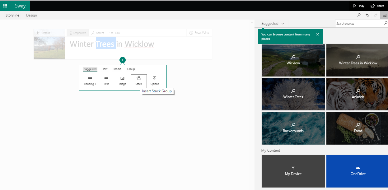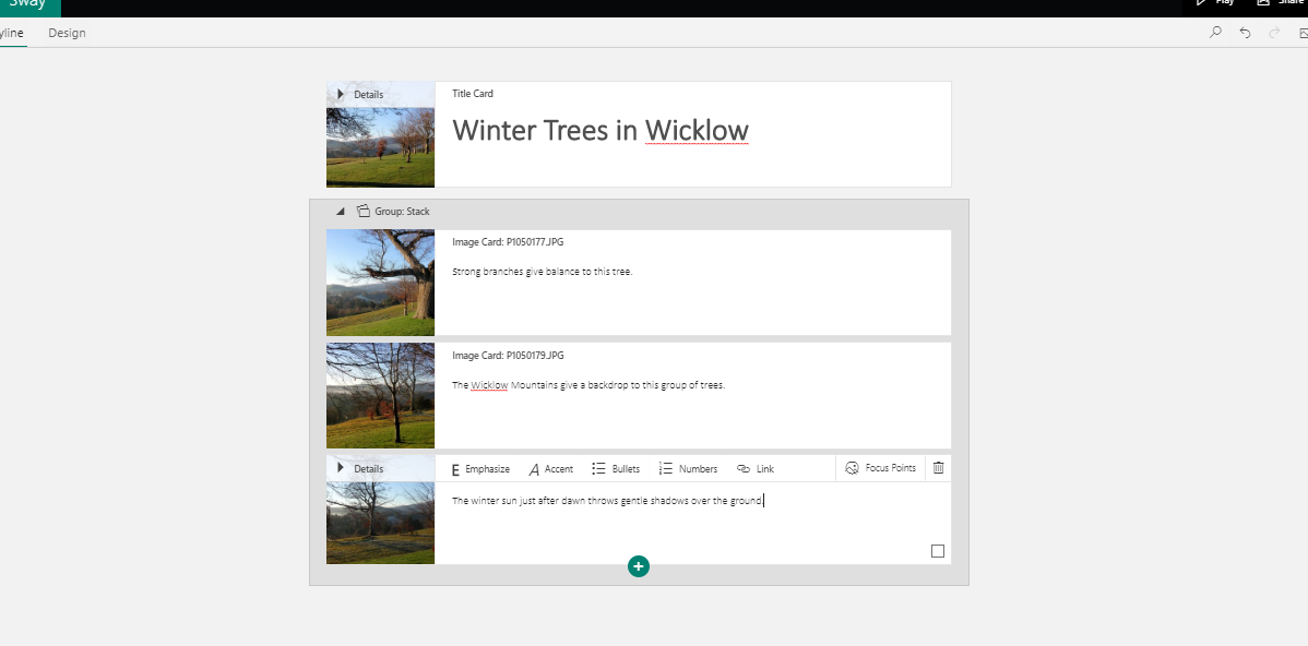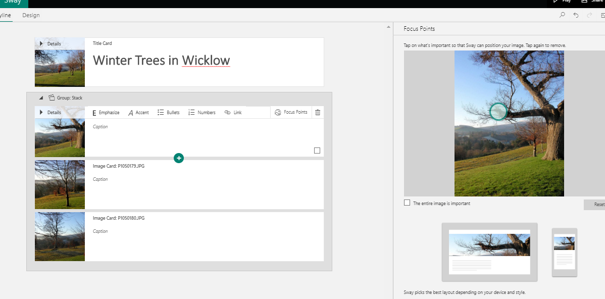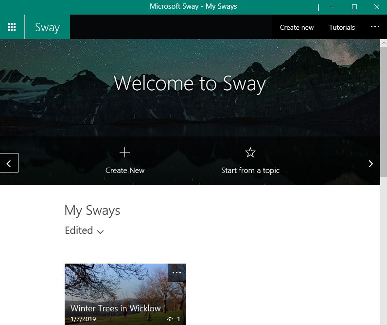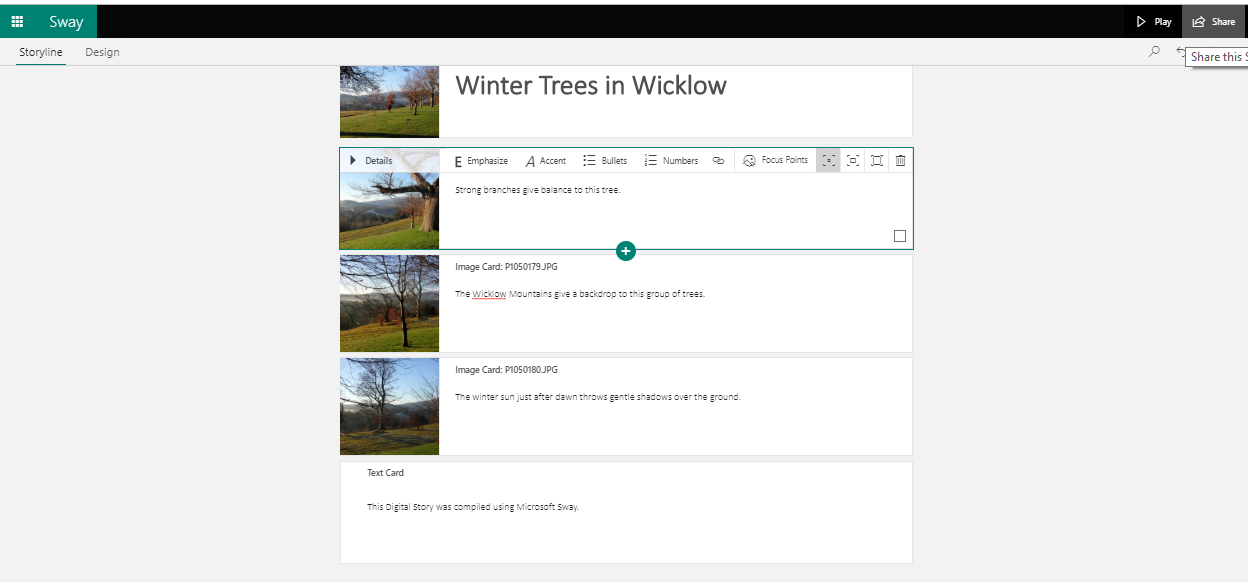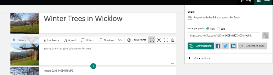 Sway is really easy to use and it can be accessed either online from office.com or from a downloadable app to a PC or laptop. I should point out that I use a paid subscription to Microsoft Office however Sway is also available in the online option as part of the free Microsoft Office offering.