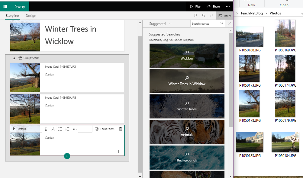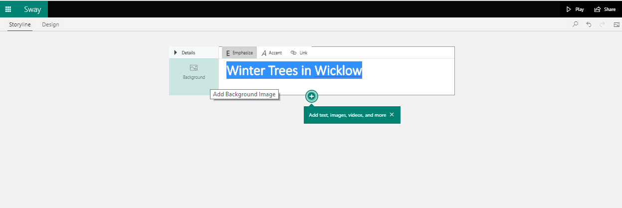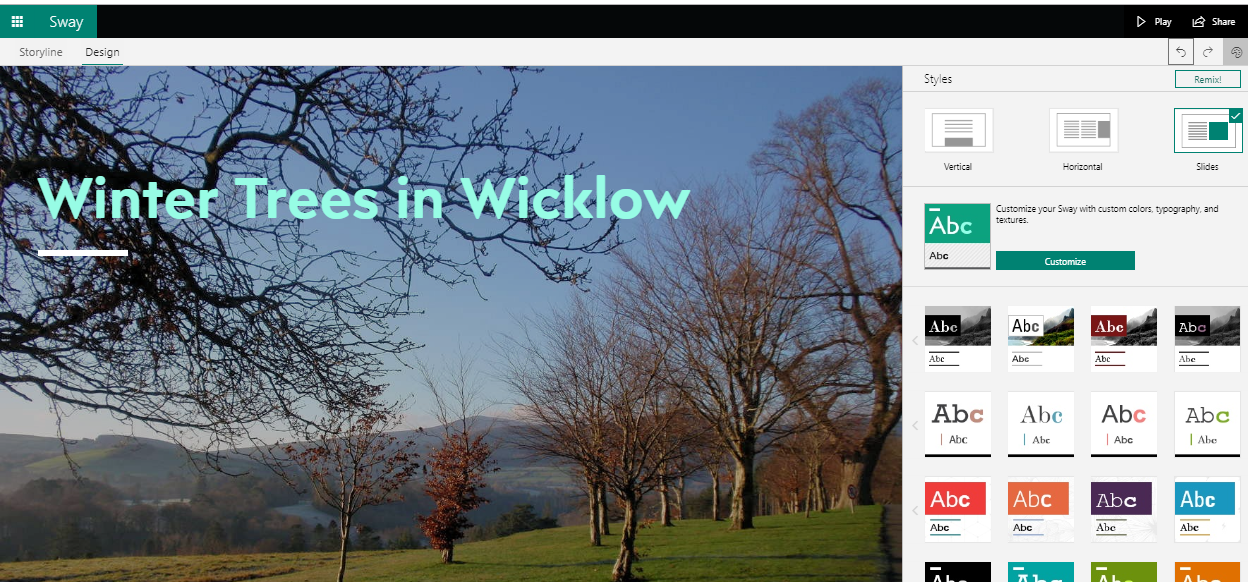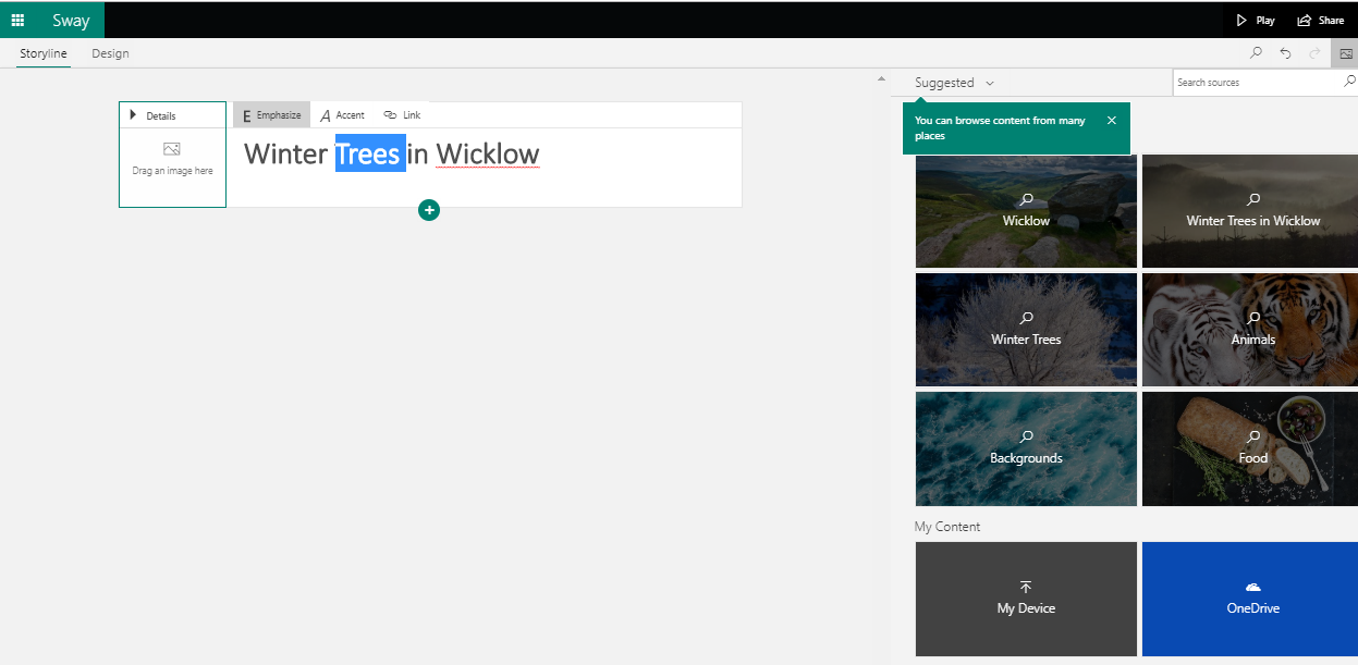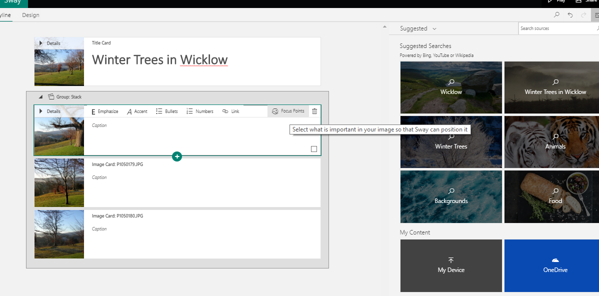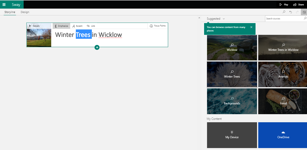 Sway is really easy to use and it can be accessed either online from office.com or from a downloadable app to a PC or laptop. I should point out that I use a paid subscription to Microsoft Office however Sway is also available in the online option as part of the free Microsoft Office offering.
