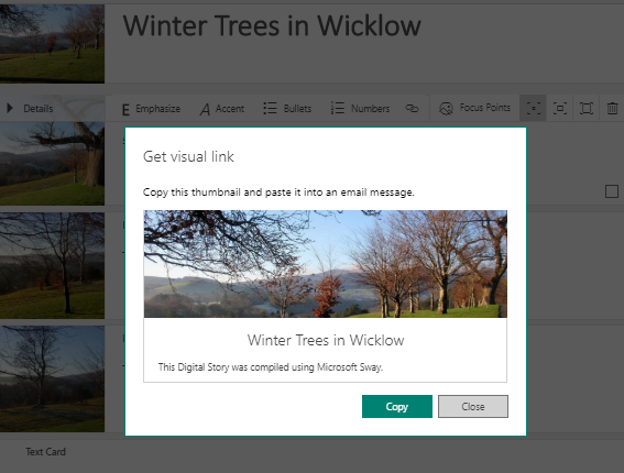 A complete Sway can be shared via a link. Here is the sample Sway I created for this Blog.
